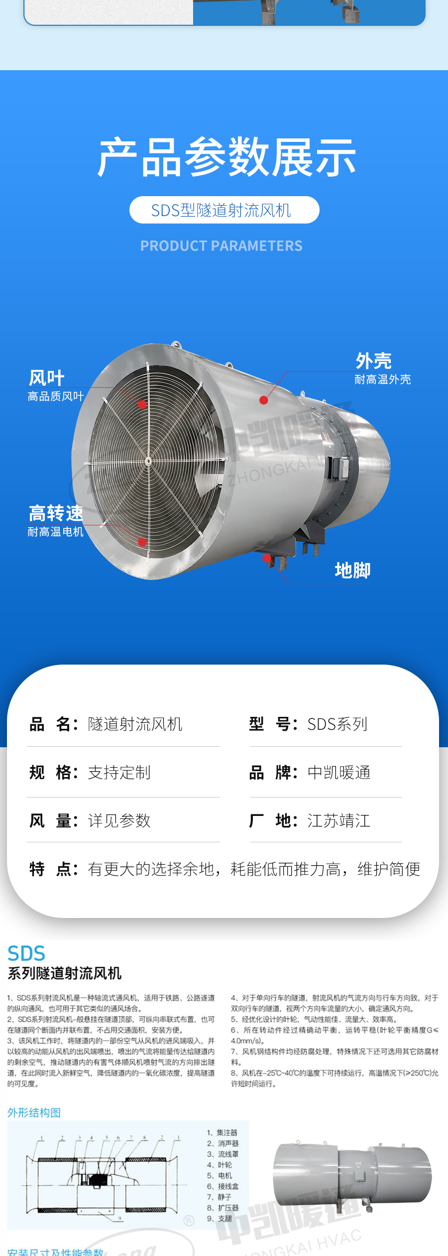 射流風機有:單向射流風機、雙向射流風機。雙向射流風機有電子式和機械式 組裝:風機組裝后,X、Y、Z軸振動速度均小于4.0mm/s 耐高溫性能:風機能在280℃高溫條件下正常運行120分鐘以上,完全符合國家 消防規范