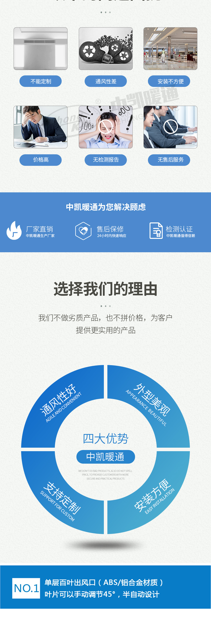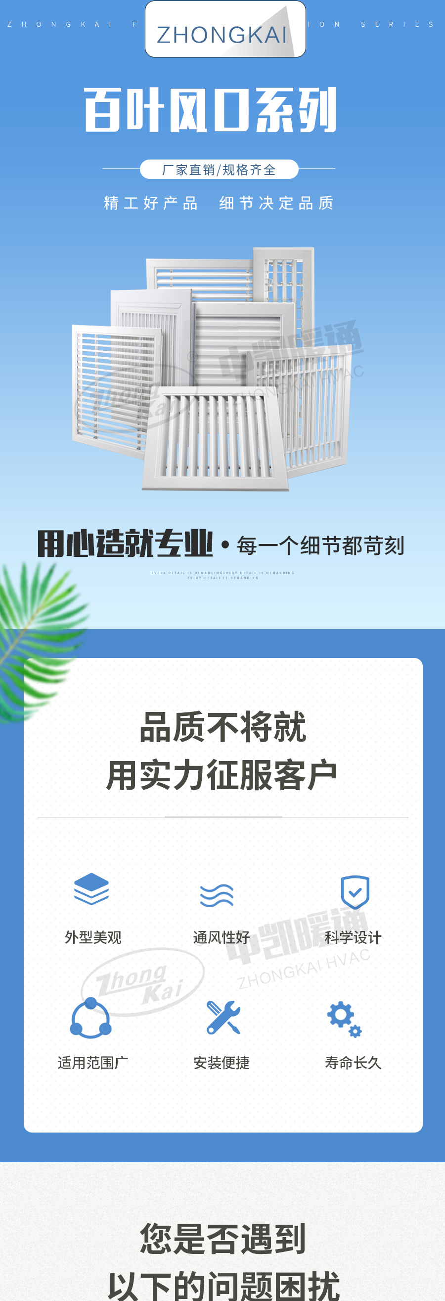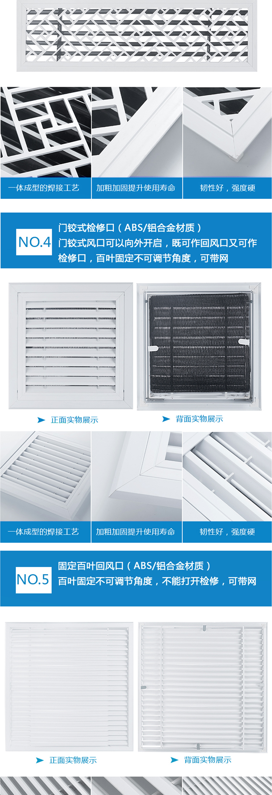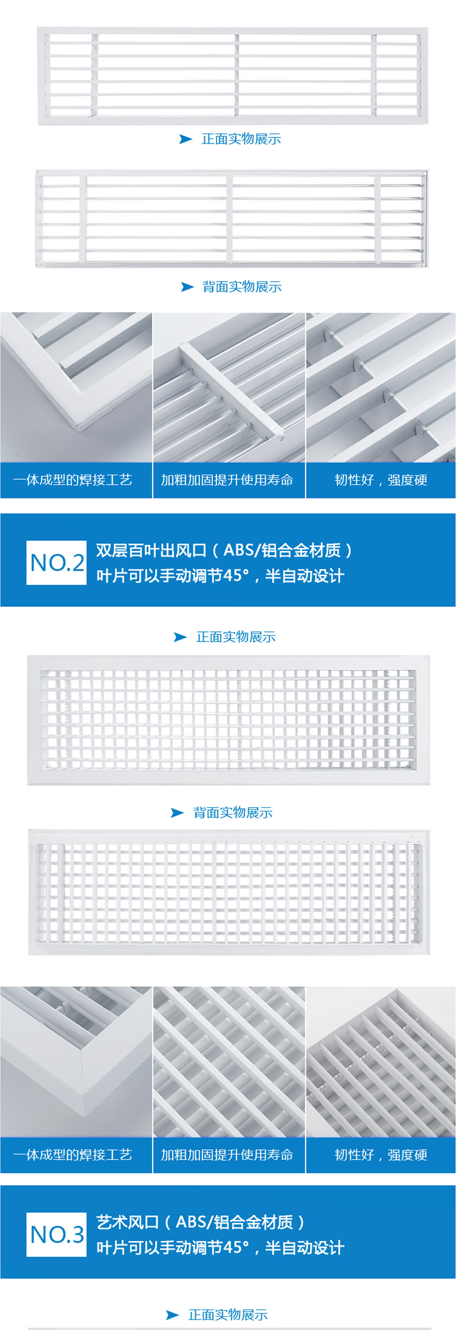 百葉風口系列是空氣分布器的一種。在空調工程中,通常將各種類型的送風口、回風口(或排風口)統稱為空氣分布器。常見的百葉風口有:單層百葉風口、雙層百葉風口、側壁格柵風口和條縫型格柵風口等。單層百葉風口經常將用于回風口,有時與鋁合金網式過濾器或尼龍過濾網配套使用。