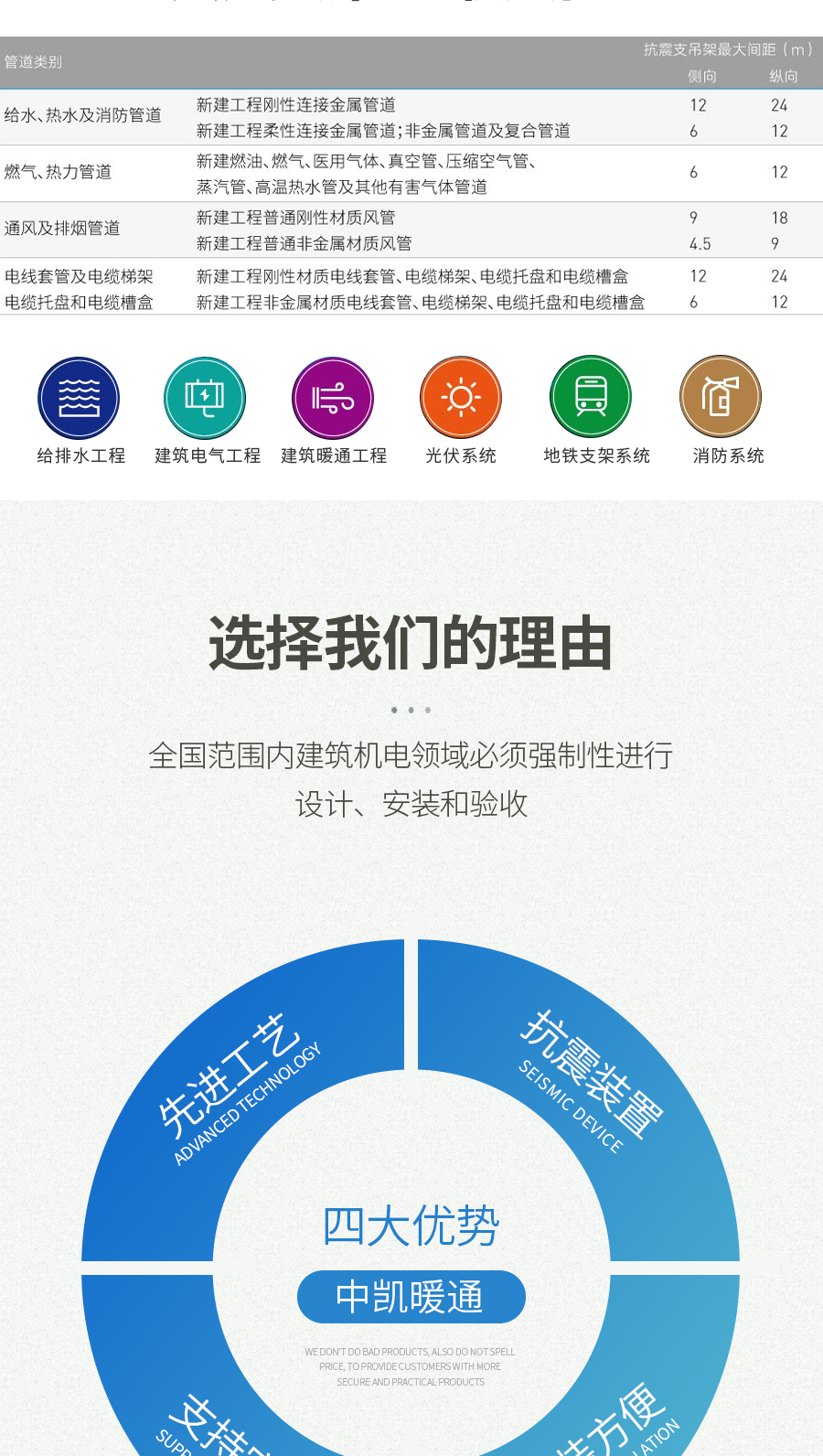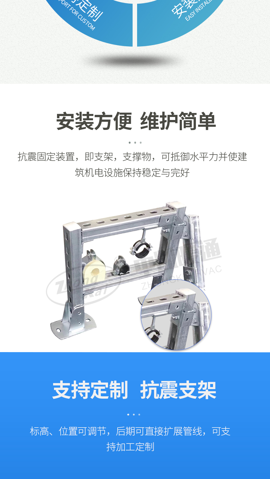 抗震支架是限制附屬機電工程設施產生位移,控制設施振動,并將荷載傳遞至承載結構上的各類組件或裝置。 抗震支架在地震中應對建筑機電工程設施給予可靠的保護,承受來自任意水平方向的地震作用;抗震支架應根據其承受的荷載進行驗算;組成抗震之架的所有構件應該采用成品構件,連接緊固件的構件應便于安裝;保溫管道的抗震支架限位應按照管道保溫后的尺寸設計,且不應限制管道熱脹冷縮產生的位移。